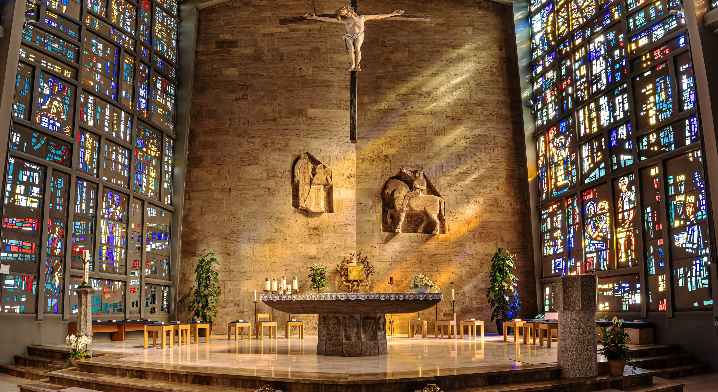 Eine spannende architektonische Mischung und ein überwältigendes Licht- und Farbenspiel erwartet die Besucher der katholischen Kirche in Gosheims Mitte. Erleben Sie den „Chartres-Effekt“ in der auch äußerlich interessanten, modernen Kirche.