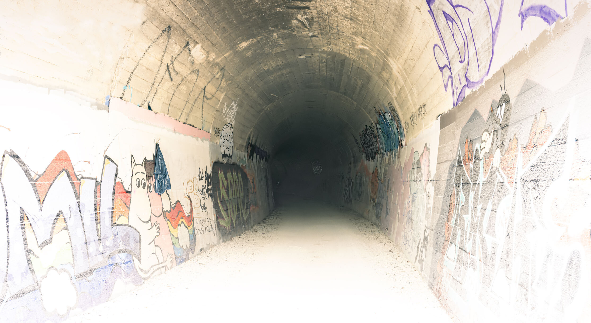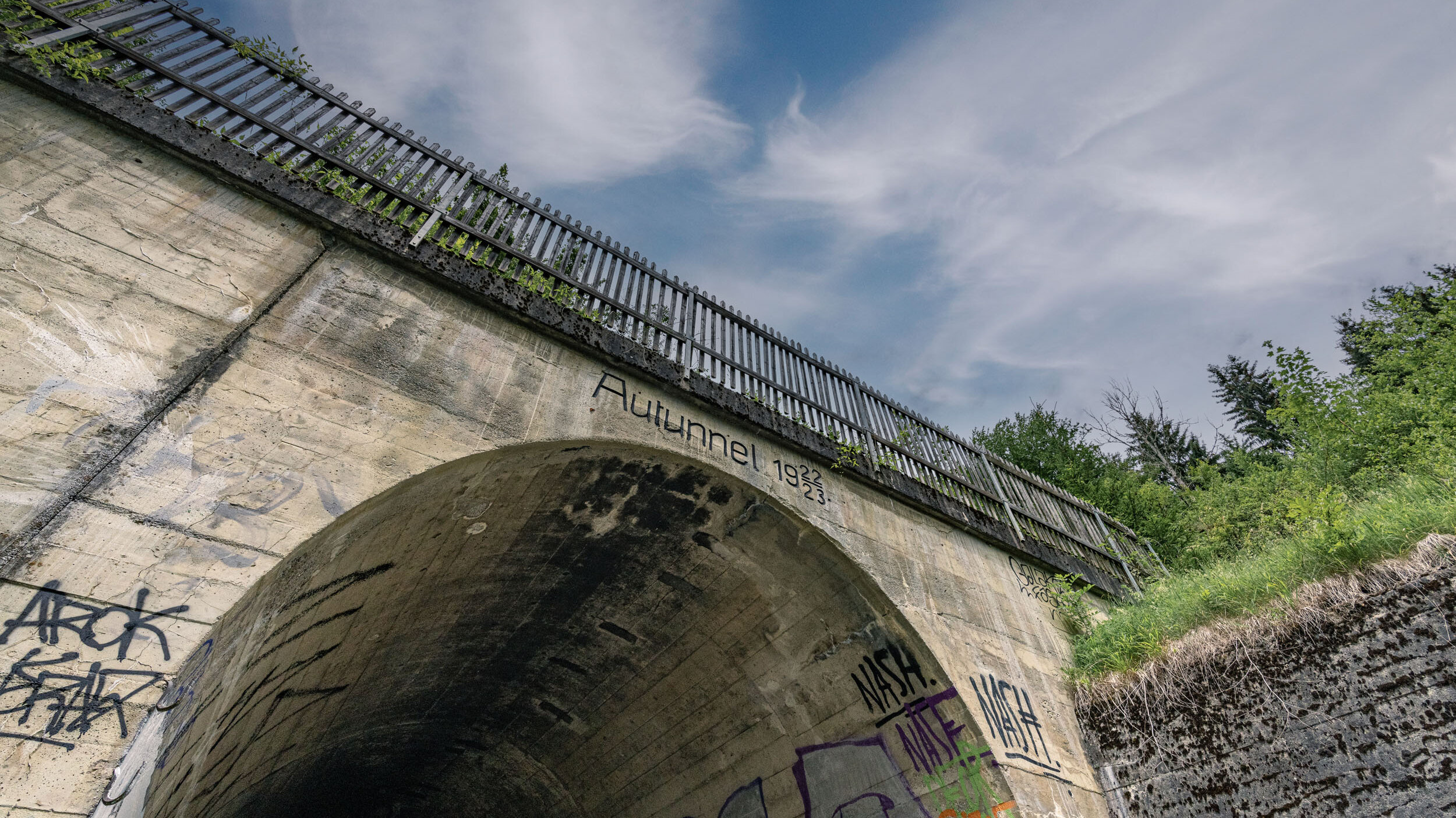 Natürlich hat auch der Autunnel ein Portal auf der jeweils gegenüberliegenden Seite: Doch durch seine Krümmung sieht man das andere Ende der 126 Meter langen Röhre nicht, bevor man einige Meter im Tunnel zurückgelegt hat. Nur Mut, es lohnt sich allemal, diese Strecke zu gehen! Umfangreiche Informationstafeln am Tunnelportal beschreiben die bewegte Geschichte der Heubergbahn und erzählen auch interessante Details zu dem Tunnel, der kurz vor Gosheim in Offenbauweise zementiert und danach erst mit Erde bedeckt wurde.